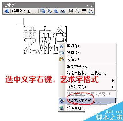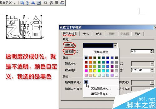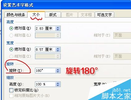 2、同样的,选中文字右键,选艺术字格式,同样修改"颜色和线条"和"大小",颜色自定,透明度0%,旋转180°