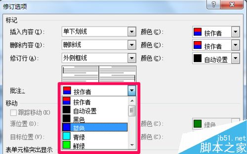 2、在修订选项的批注中选择需要的word批注颜色然后确定。