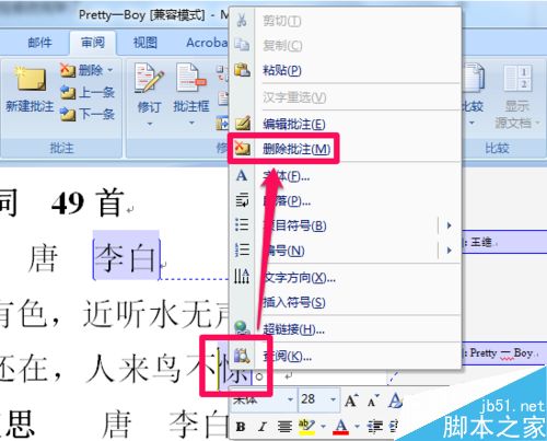 2、word删除批注的第二种方法就是将光标定位在word批注中,然后右键单击选择删除批注就可以了。