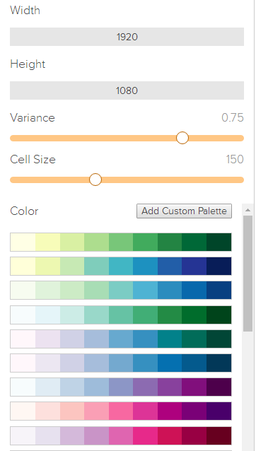 第一个是尺寸的设置这个咋样都随你啦,一般都是默认不用改。下面Variance控制的晶体的规则性,数值越大,晶格越不规则,Cell Size控制的是晶格的大小,当设置最小的时候,就出现了我们的IOS风格的效果,最下面就是颜色栏,这个网站已经给出了非常多的配色,当然如果你觉得不满意的话,可以自己添加配色,点击Add Custom Palette就行。