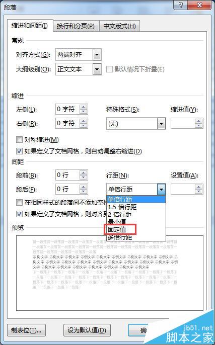 2、将弹出对话框中间位置的行距更改为固定值。如下图所示: