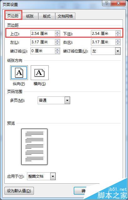 2、在弹出对话框页边距版面,将页边距的上下值修改得小一些即可(也可以只修改上面的页边距或者下面的页边距)。如下图所示: