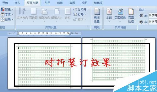 网格类型的设置:单击"网格"右侧下拉列表,可以看到共有三种形式的网格:网格、行线和边框,并选中网格。网格颜色选择:"网格颜色"右侧下拉列表中选择一种自己喜爱的网格颜色,比如常用绿色和红色作为网格颜色。(注:在日常生活中能看到这两种颜色)对折装订设置:如果需要就,勾中此项。此功能是:将一页稿纸对折,分成两页,效果如图所示。