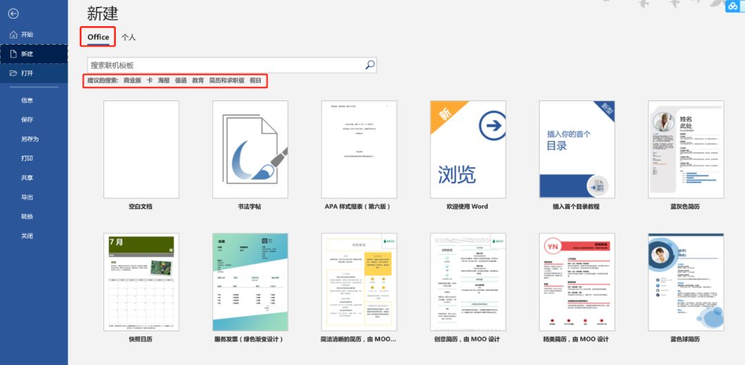有两大分类:(1)「Office」里面即是系统提供的模板,可以使用建议的搜索关键词对模板筛选,也可以输入关键词搜索联机模板。