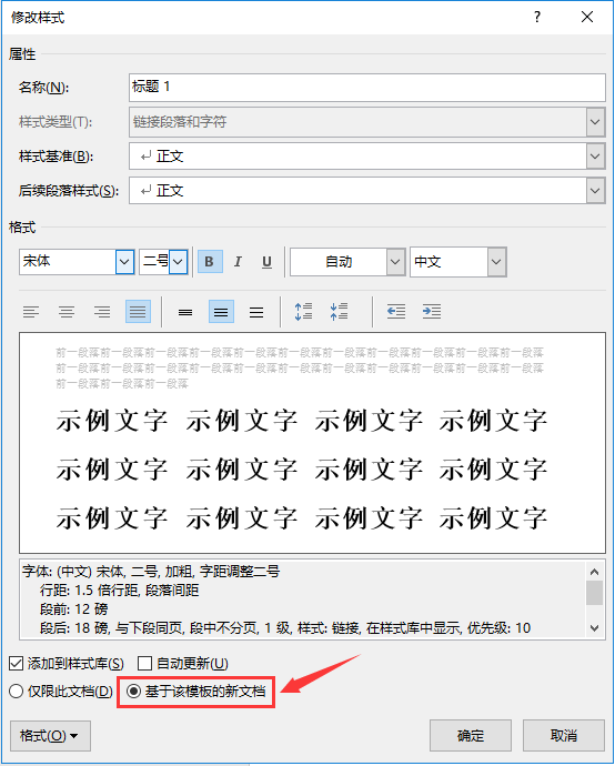在弹出的“修改样式”对话框中选择“基于该模板的新文档”,那么,对样式所做的更改就会同步更新至该文档所使用的文档中。