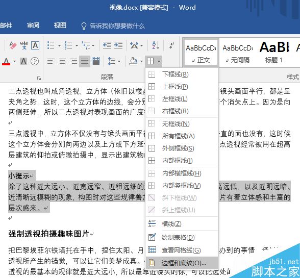 首先打开纯文字的文档,小编所用的示例中,文中的小提示内容完全可以与正文有所区别,所以小编决定为此段落添加边框进行装饰。选取要进行装饰的文字段落,然后在"开始"选项卡的"段落"中,点击"边框"右侧的下拉按钮,从弹出的下拉列表中,选择"边框和底纹"。