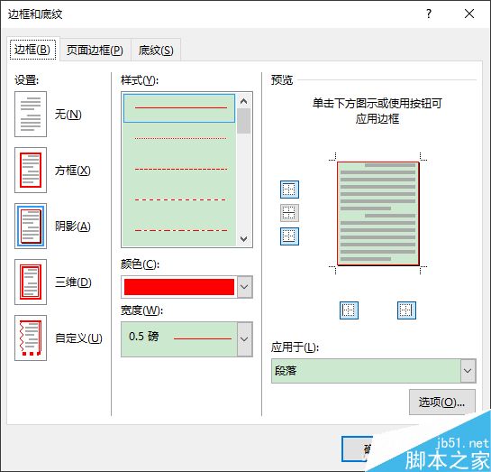 在打开的边框和底纹对话框中,分别在"边框"、"底纹"选项卡中,按提示进行边框的颜色、大小、立体阴影、底纹颜色等进行设置。