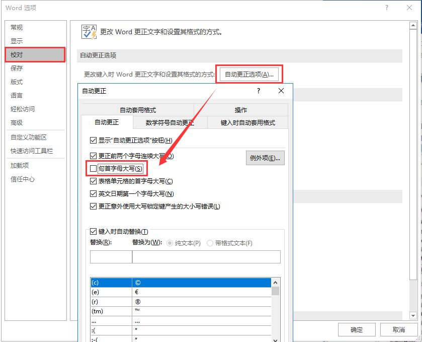 单击【文件】-【选项】-【校对】-【自动更正选项】按钮,打开【自动更正】对话框,取消勾选“句首字母大写”复选框,单击“确定”按钮即可。