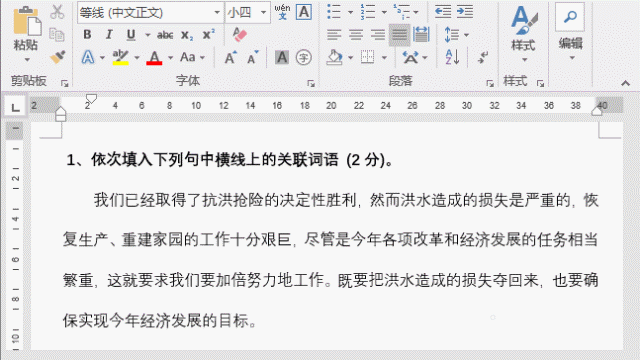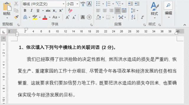 但是,一般我们试卷的填空题型较多,如果采用以上两种方法制作,很明显效率并不会快。因此,这些方法只能针对填空题较少的情况比较适用。那么,想要提高效率,横线该如何输入呢?今天,我们用“查找与替换”就可以轻松解决这个问题。(1)首先选中要留空的文字(可按住Ctrl键进行多选),设置文字颜色为“白色”。
