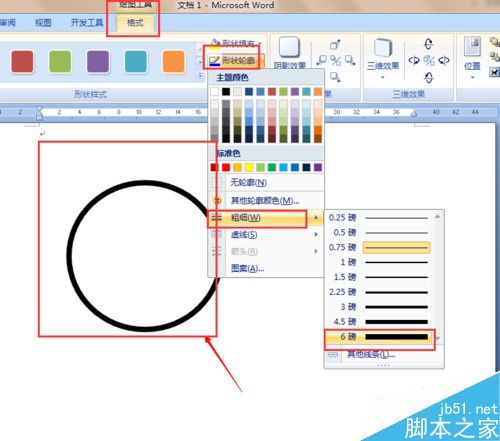 2、【格式】菜单-【形状轮廓】-【粗细】-【6磅】。如下图所示: