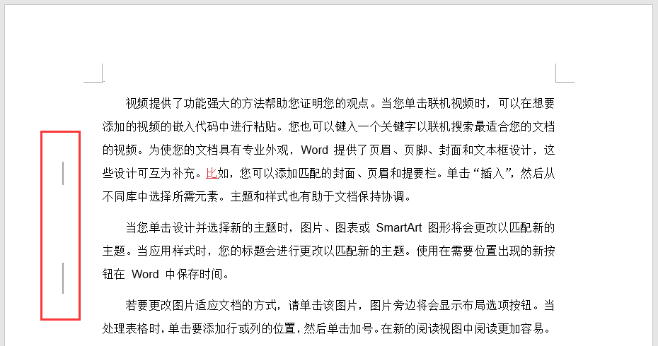 有时候,如果文档开启了修订功能,默认情况下,在页面的左侧会出现红色或者灰色的竖线,如下图所示。