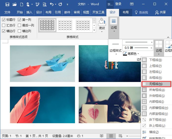 (5)再次选择整个表格,点击【表格工具】-【设计】-【边框】。选择【边框】-【无线框】选项,取消表格边框。