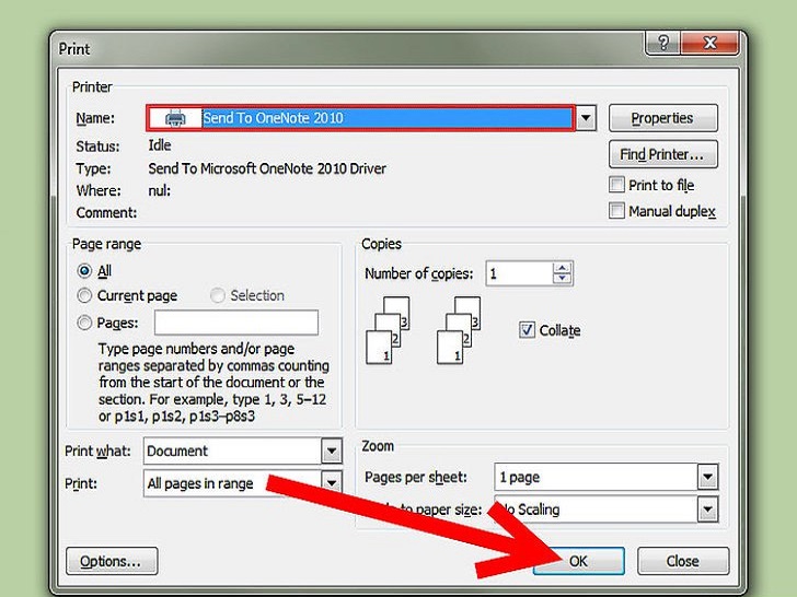 在打印机菜单上选择“发送到OneNote”,单击打印 。