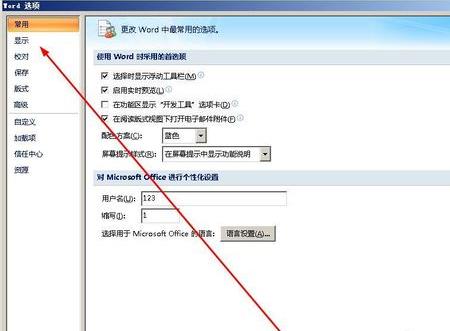 3、在word选项中,点击显示选项。