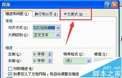 2、在段落选项窗口里,再选择右边的"中文版式"选项页面: