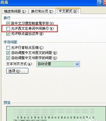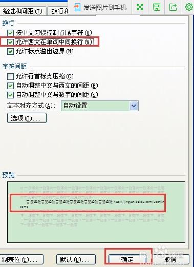 4、我们勾选这个"允许西文在单词中间换行"选项,可以看到预览这里与刚才的格式变化了,再点击确定按钮: