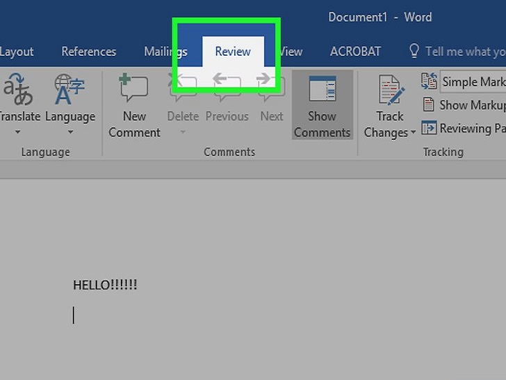 点击审阅选项卡。它位于文档页面顶部的蓝色部分里。点击它,打开新的选项组来编辑文档。