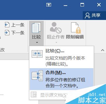 这时,新建一个Word文档,切换选项卡到审阅,最右侧选择"比较"中的"合并"
