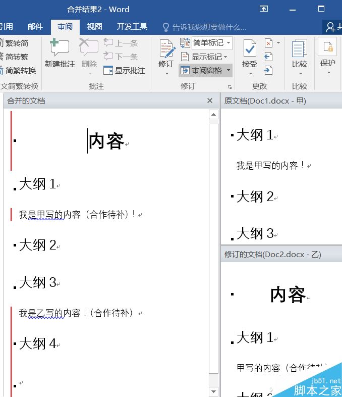 合并后,甲乙写作的部分都已经合并到相应位置(注意,前提是文章大纲的格式一致),不过处于修订状态。