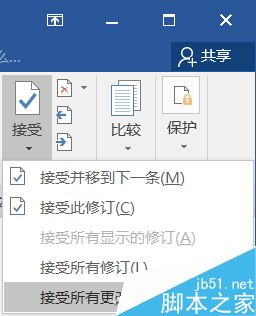 此时,点击审阅选项卡中的"接受",选择"接受所有更改并停止修订",文档内容就可以无缝合并到一个文档里面了。