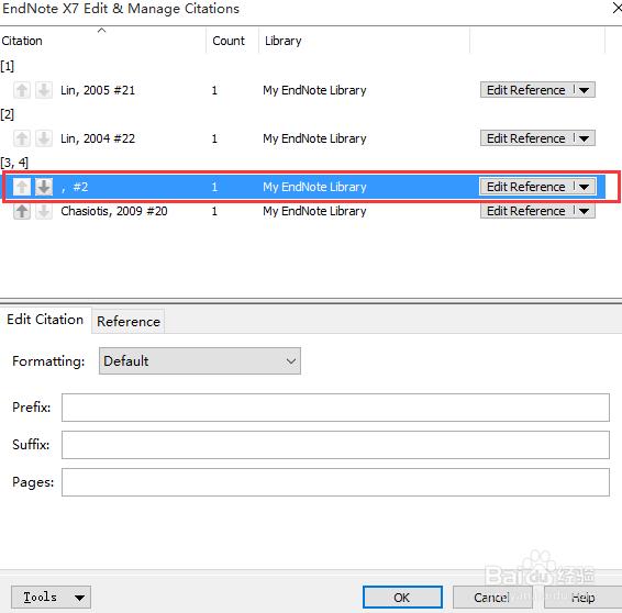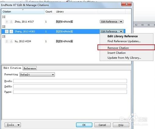 3、在弹出来的窗口中,找到我们要删的那篇参考文献,点击后面的edit reference下拉箭头