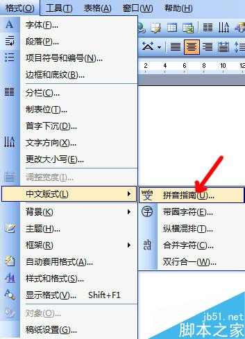 2、点击工具栏上的"拼音指南",或选择"格式"菜单"中文版式"里的"拼音指南"。