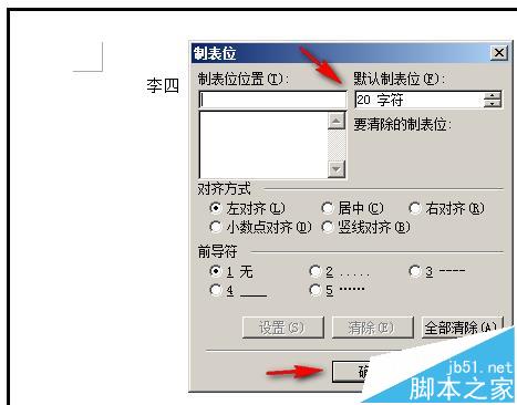 6、说到这个"制表位",小编在这里顺便说下"制作位"的其中一个功能。比如,在文档上输入"李四";现在想把"四"字移到第20字符的位置;那么,操作如下;把光标定位在"四"的前面;