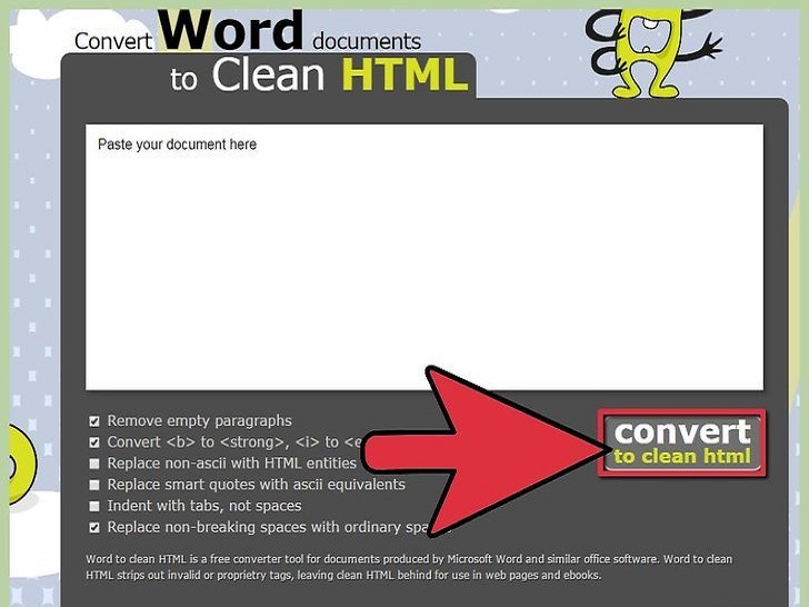- Word2CleanHTML 会抹除文档中的大部分文档格式,然后遵循网页开发人员的最佳做法创建一个HTML格式的文档网页。同时,它也会提供更多独特转换的多个选项功能,例如如何处理非标准字符和空白段落。