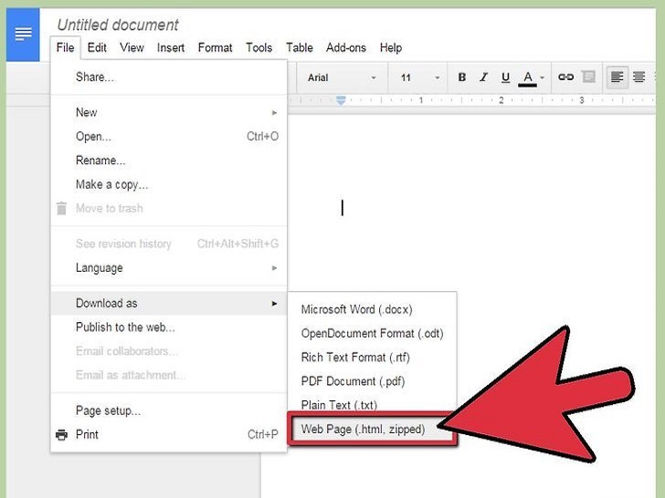 - 使用谷歌文档菜单选择 文件 → 下载为 → 网页按钮。