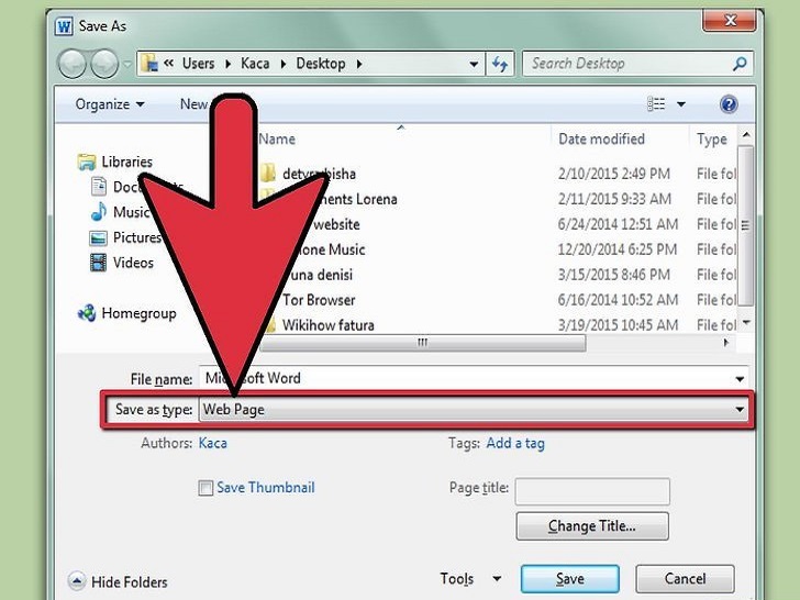 选择“网页” 当你选择“另存为”后,你会被带到有一个下拉菜单的界面,菜单中罗列着各种各样的你可以将文档另存为的文件格式。选择“网页”来将它保存为HTML格式文件。