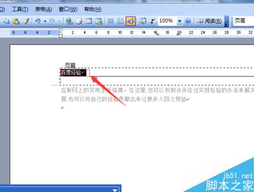2双击完之后就会进行到页眉编辑,可以进行选中页眉中的文字。如图的"百度经验"文字