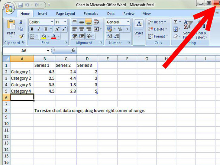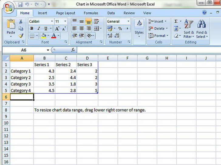 选择了图表,又选好了样式以后,会出现另一个窗口。你会看到一个Excel电子表格嵌入了Word文档中。在表格中可以看到4个分类(纵向)和3个系列(横向)。想改变数据,改变对应的单元格就行了。
