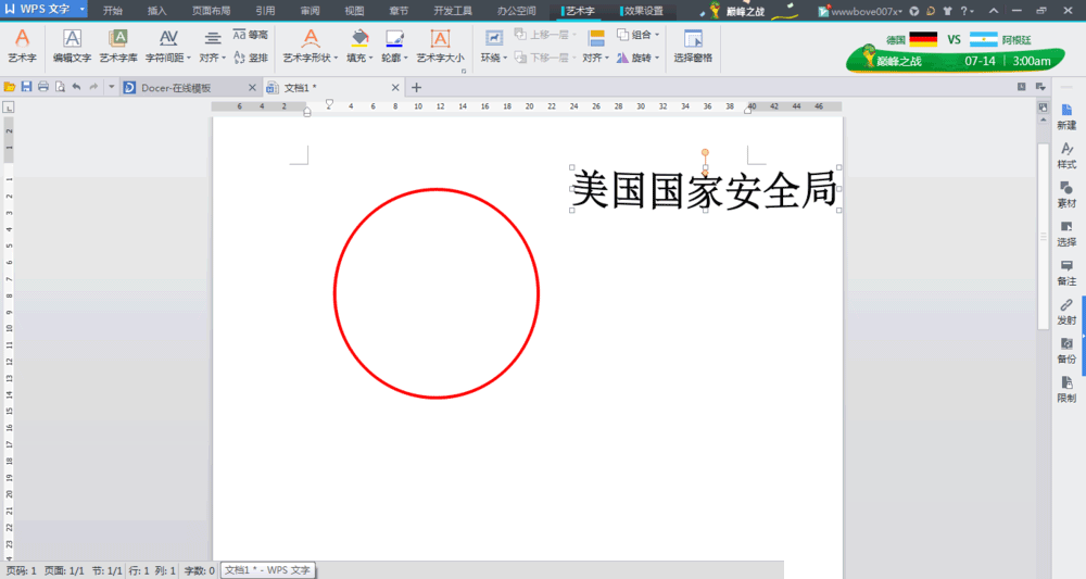 7、先插入艺术字。选第一种艺术字,输入 美 国 国 家 安 全 局(最好每个字之间加空空格)。