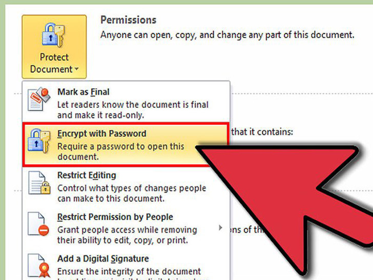 点击保护文档。这个方形的按钮位于“有关<文档名>的信息”部分下。点击出现的菜单中的“用密码进行加密”选项。