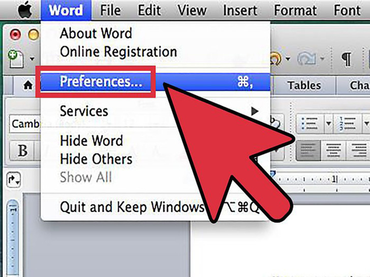 点击Word菜单。它位于左上角位置、苹果菜单和文件菜单之间。选择参数选择。