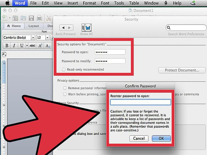 点击“加密文档”。接着出现一个小对话框,你可以输入你想要设置的密码。你需要再次输入密码以确认。如果你忘记它将无法再找回密码,所以请把密码记在安全的位置中以防丢失。