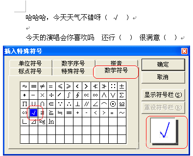 点击插入——特特殊符号——数学符号——选择对勾,如下图所示。