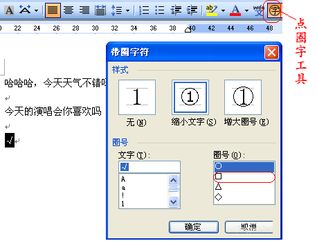 先输入√或者插入√,再选择工具栏的圈字,如下图所示。
