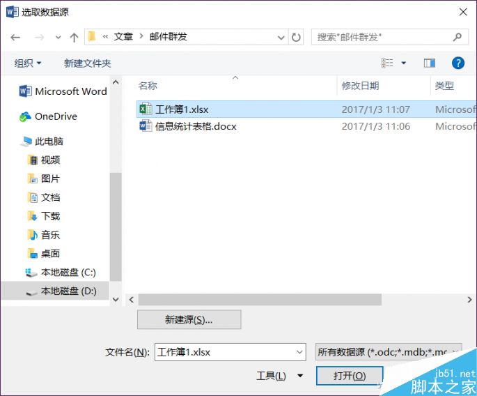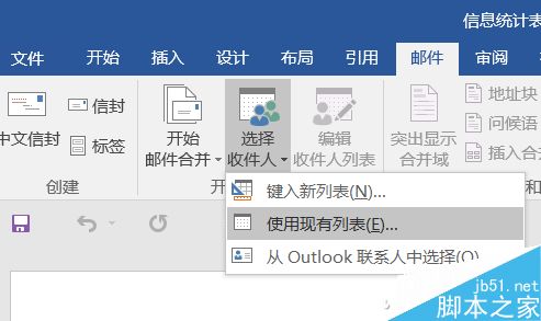 在Word中做成需要填写信息的基础表格,然后切换Word选项卡到"邮件",点击"选择收件人—使用现有列表"。