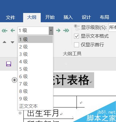 这时,圈选表格标题,在"大纲"选项卡中,选择"1级"。