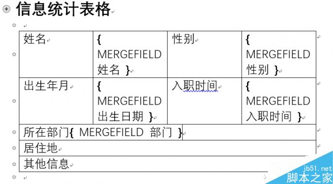 制作完成后,应该如图例中所示,每个空白表格都有标识内容如{MERGEFIELD姓名}等等。