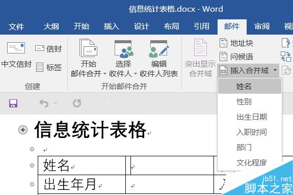 然后,继续切换选项卡到"邮件",单击每一个Word表格中的空白项,并在"插入合并域"对话框选择相应的Excel数据项,如姓名、性别、性别、出生日期等,一一对应。
