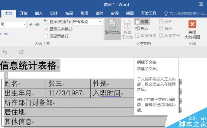 这时候,Word文档已经自动完成填充,生成与Excel统计信息中对应的姓名表格统计信息,并且变成了一个独立的"信函1"文档。但是这样都是合并在同一个Word文档下,要分发给每个人不仅要继续调整Word文档,还需要打印后再手工裁切,非常麻烦。这就需要最后一个步骤了——按下Ctrl+A全选内容,切换到"大纲"选项卡然后点击"显示文档—创建",然后点击保存,系统就会自动将其拆分成对应人数数量的Word文档,这样再依次打印就可以了。