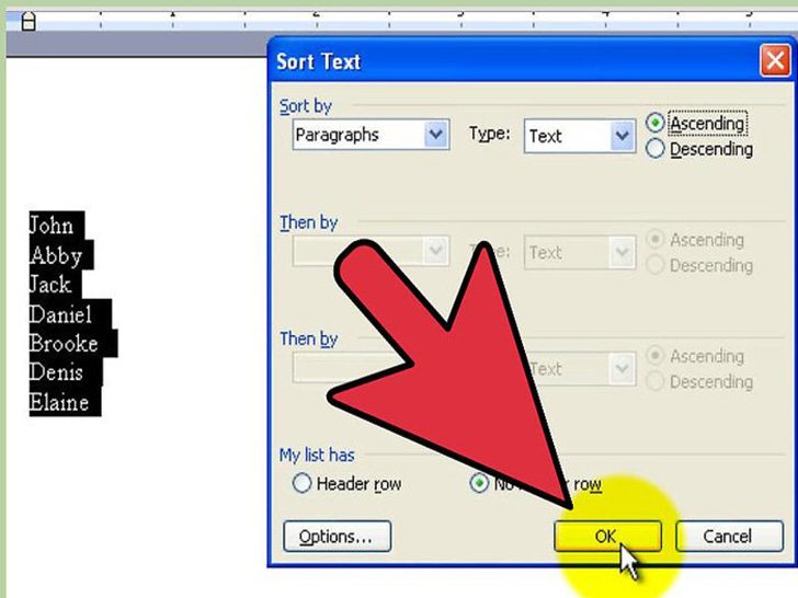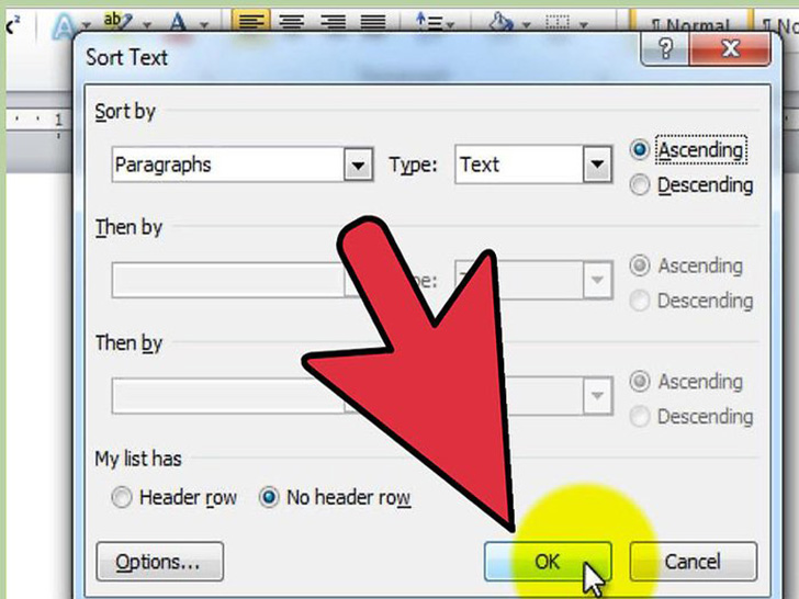 - 如果要按每个条目的第二个字排序(例如在名,姓格式中按姓排序) ,单击“排序文字”窗口中的“选项”按钮。在“独立领域”一节中,选择“其他” ,并输入一个空格。按“确定” ,然后在排序菜单中选择第2个字。按“确定”对列表进行排序。