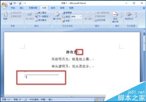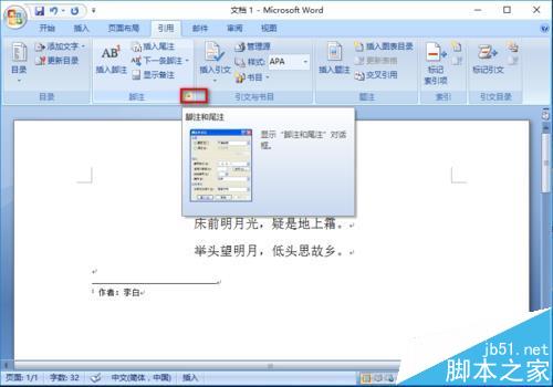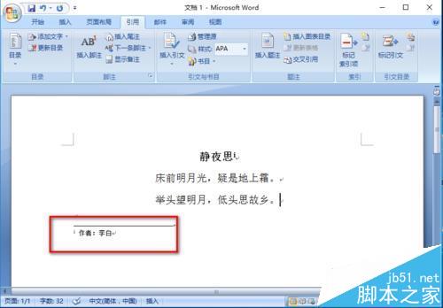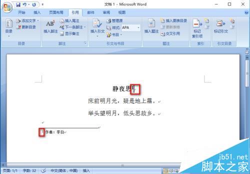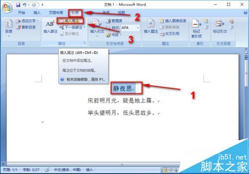 2、选中"静夜思",选择"引用",选择"插入尾注"