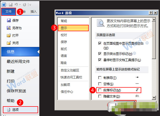 1、单击窗口左上角的"文件"按钮,选择"选项",然后选择"显示",并取消段落标记前的钩钩。 (电脑入门到精通网 www.58116.cn)
