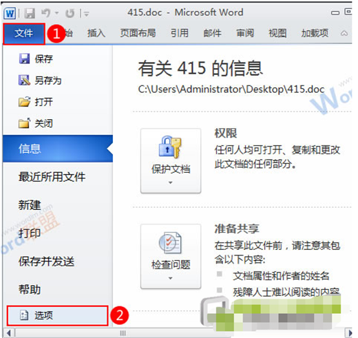 1、单击Word窗口左上角的"文件"按钮,然后在打开的面板中选择"选项"。