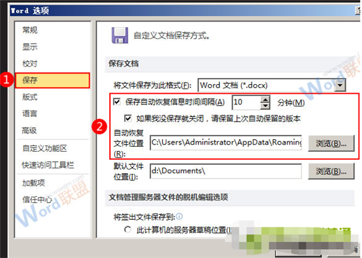 2、此时会弹出一个"Word选项"窗口,选择"保存",然后设置自动恢复文档的时间间隔和路径位置。