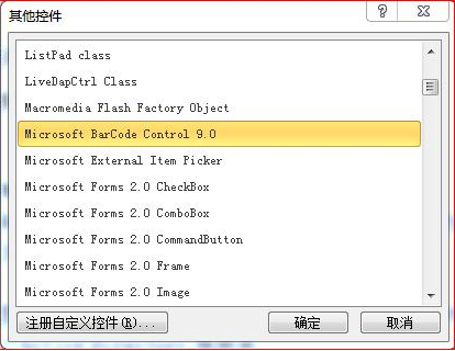 —注册自定义控件—找到路径下的"Microsoft BarCode Control 9.0"控件,注册就可以使用了。