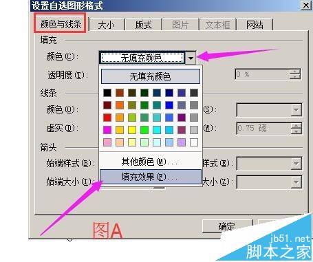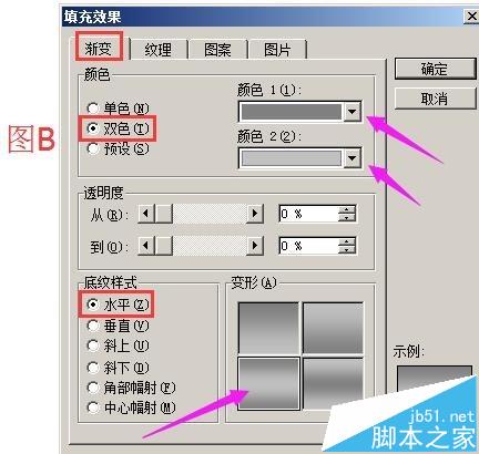 2、双击图形,弹出的"设置自选图形格式"操作框;在"线条颜色"这里点右侧的三角形,弹出的菜单中点"无线条颜色";在"填充颜色"这里点右侧的三角形,弹出的菜单中点"填充颜色";转到"填充颜色"操作框;如图B;在"颜色"这里选"双色";在"颜色1"这里点选"灰色-50%";在"颜色2"这里点选"灰色-25%";在"底纹样式"这里点选"水平";在"变形"这里点选下面排的第一个变形。然后,点确定。转回到"设置自选图形格式"操作框再点确定。